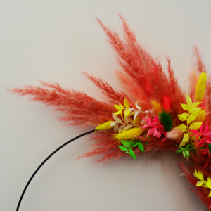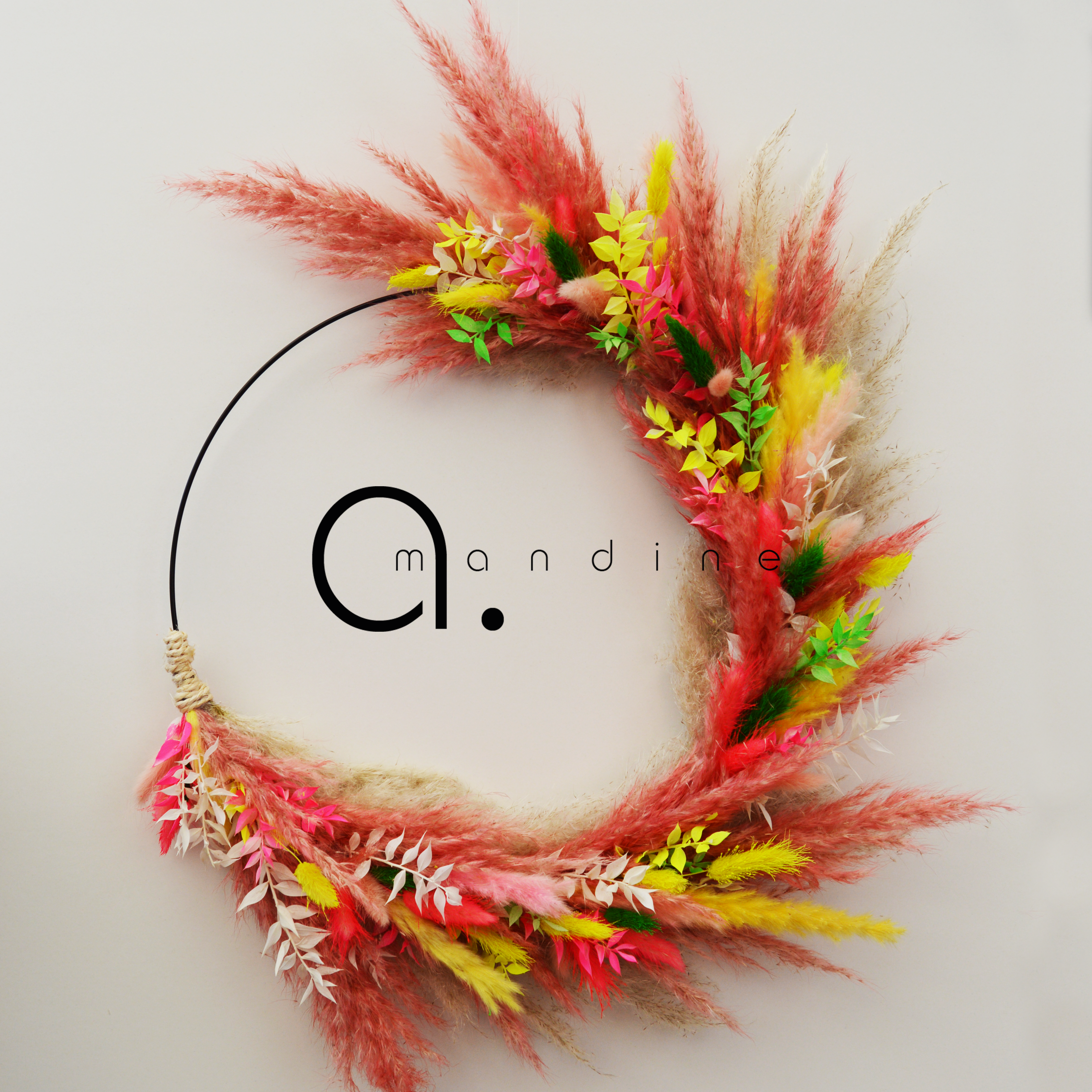 Cerceau en métal noir Ø 35cm orné de fleurs séchées dans les tons rose/jaune/vert néon (*)