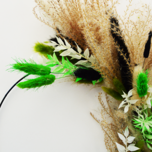 Cerceau en métal noir Ø 25cm orné de fleurs séchées dans les tons beige/vert néon (*)